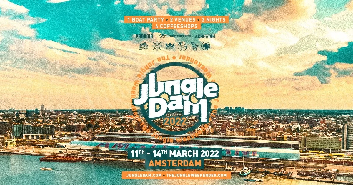 Promotional poster for Jungle Dance 2022 festival in Amsterdam, featuring a cityscape and a waterfront, with event details including dates, location, and activities.