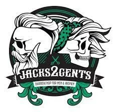 Illustration of two skulls with hair, a snake, a dagger, and decorative elements. Text reads 'Jacks 2 Cents' and 'Barbershop for Men & Women'.