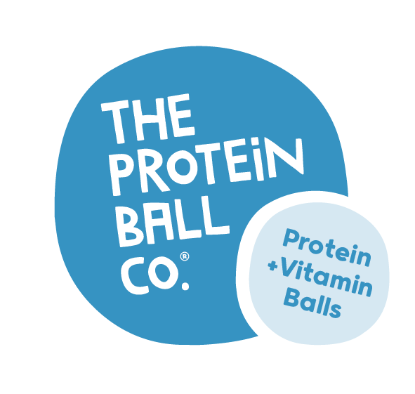 Logo for The Protein Ball Co., featuring a blue circle with white text, and a smaller light blue circle with dark blue text that says 'Protein + Vitamin Balls'.